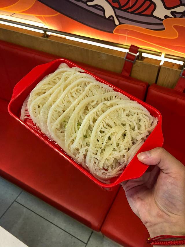 千层肚:这是我吃火锅和串串必点的头等菜,满满一盘千层肚,倒进锅里煮上20秒,味道全都煮进千层肚里,口口那个香辣脆的感觉,根本是停不下来,不要说有多好吃了。