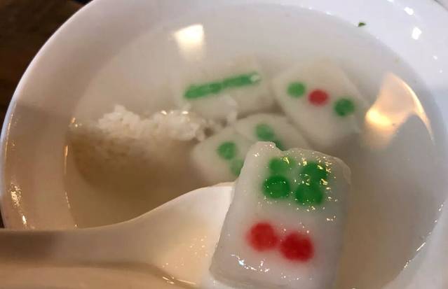麻将是四川的特色代表之一,将汤圆做成麻将的样子,比传统的汤圆更加有新意且有趣,麻将汤圆的颜值非常高,很是逼真,仿佛再吃真的麻将,汤圆是黑芝麻馅的,外皮软糯,内里丰富,咬一口,都能溢出满满的黑芝麻,解腻又爽口。