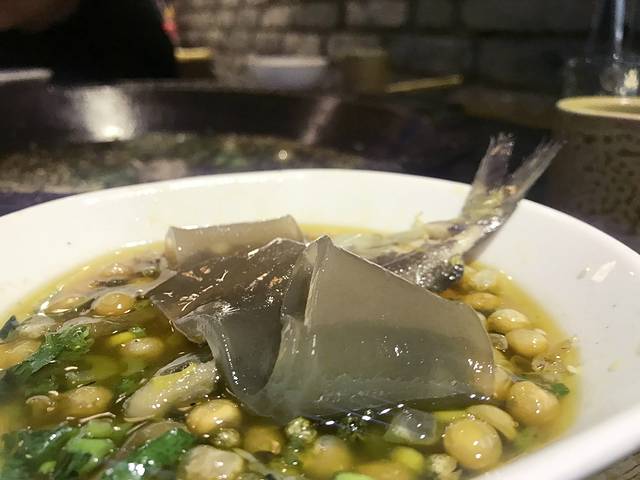 鱼是现吃现杀的,江团和三角峰值得推荐,江团切成鱼块下锅,肥美鲜嫩;三角峰是一整条完整的放进锅里,肉质同样非常鲜嫩,也没有不易挑剔的小刺。