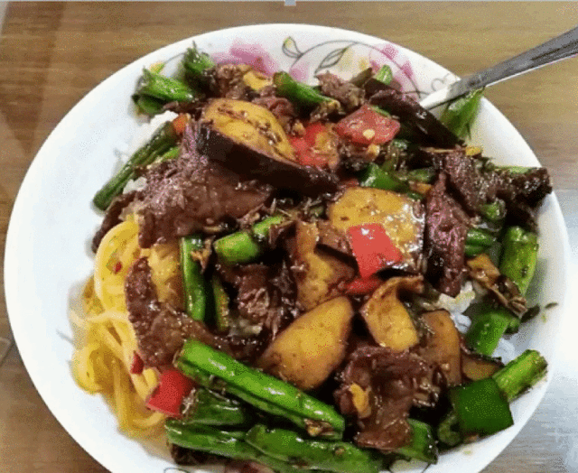 杨裕兴的辣椒炒肉带迅干多放点醋是真的好吃,带迅干是一种老长沙的说法,就是硬一些的硬碱面,在滚水中一带而过,待它稍软化后迅速的放在在一旁的料码碗之中,这也是带迅干这个说法的由来,非常的好吃。