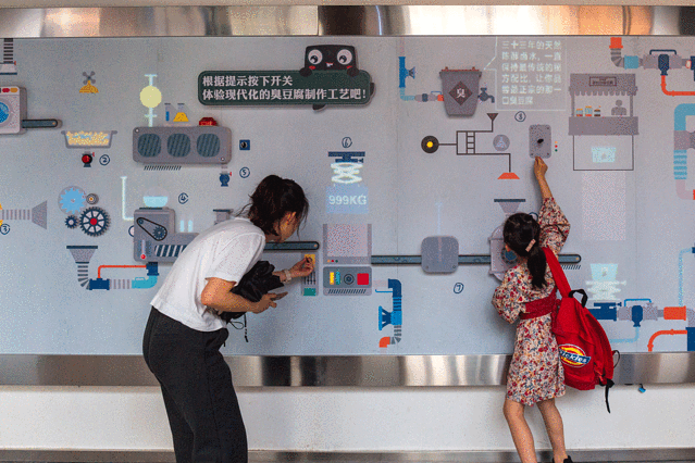 洗豆、泡豆、磨豆、煮浆、点卤、压制、切块、泡卤水,每一块臭豆腐的诞生,都伴随着这些看上去有些眼花缭乱的工艺,按下互动墙的按钮,这8个流程便会清晰地展现在你面前。