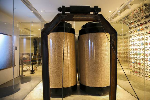 再往里走, 3米宽的玻璃幕墙投影中,水缸里起伏的小豆子正在接受筛选,只有优秀的豆子才能脱颖而出,将最好口感呈现给你。试试把手放上去,豆子们都朝你涌过来了。