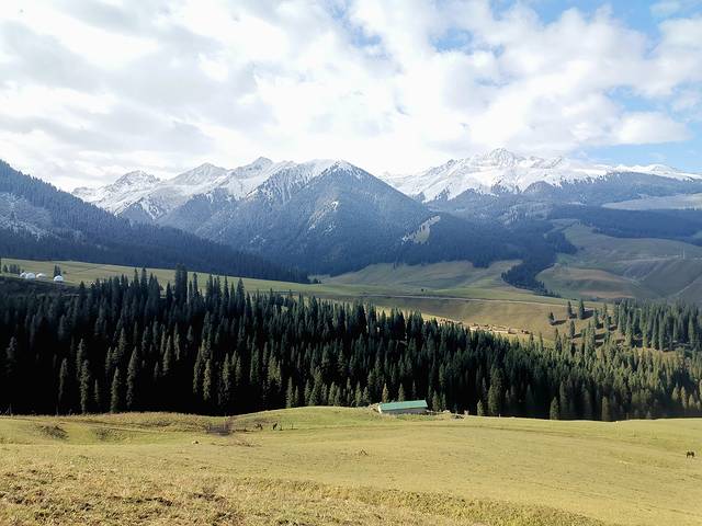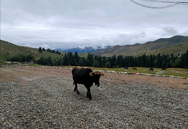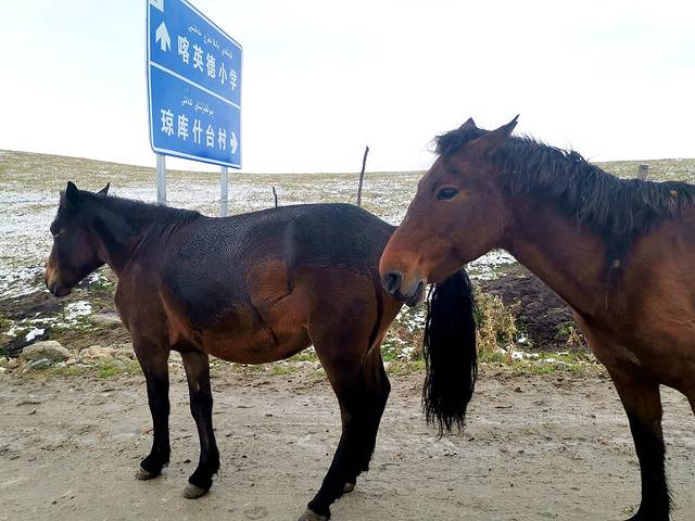 然后我们自驾两个多小时到达喀拉峻草原,结果天气太差,山上突然下雨雪,裹得严严实实准备上山,工作人员都说能见度差,刚下来的游客也说没什么看的。寒风苦雨中冻得瑟瑟发抖考虑了一小会儿,当机立断临时改变行程前往琼库什台村。幸好在琼库什台预定住宿的老板特别的好,本来我们定的是第二天的房,同意我们改成当晚的。