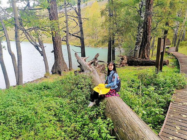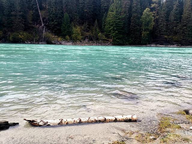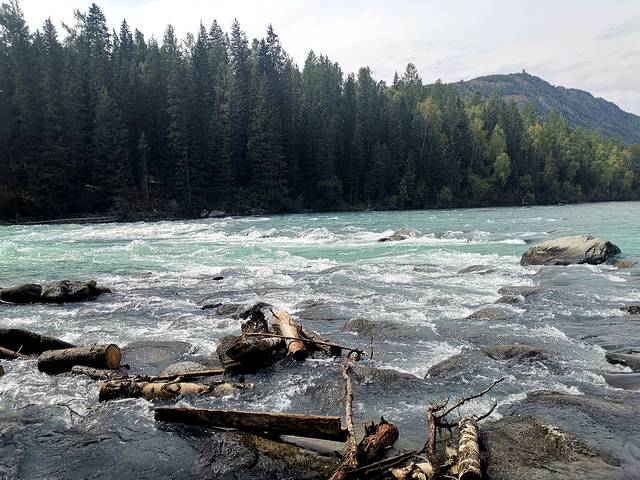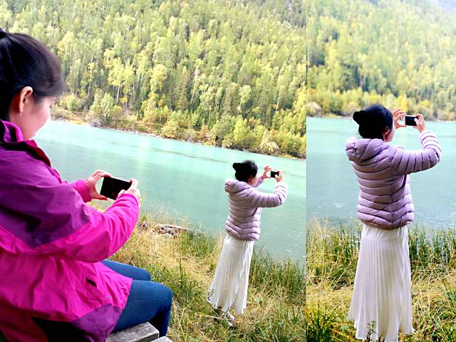 从观鱼台下来,我们换乘到喀纳斯湖边,10分钟路程吧,近距离看湖面颜色偏淡绿了,不像高处看到的湖面颜色是明媚的湖蓝色。(其实一路好奇为什么新疆的湖水、河水多呈现蓝色绿色的,网友说一是水的污染少 ,二是水里的生物、矿物质的颜色影响,三是新疆的天空比内地的蓝,晴天多,阳光的反射作用使得颜色更鲜明)