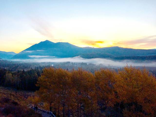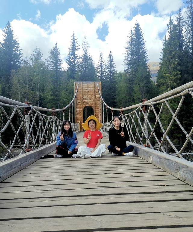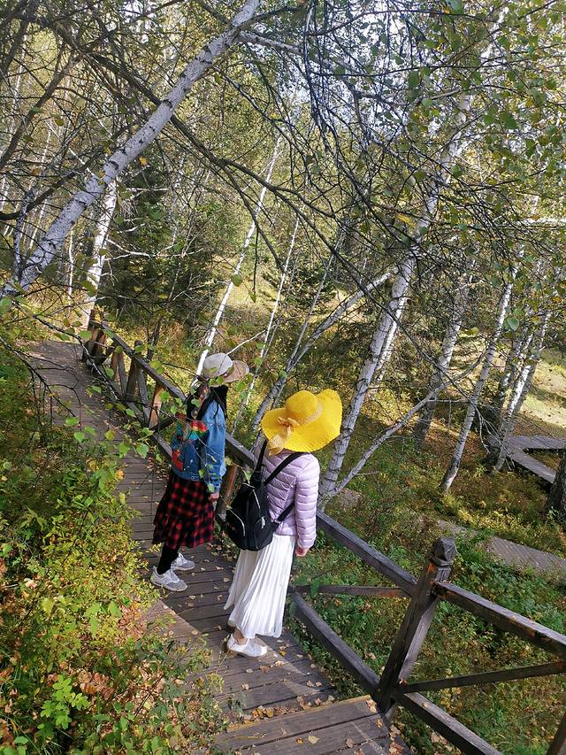 第二天一早6点半就醒了,惦记着禾木的晨雾,老板说7点出发差不多了,我和漾顶着露水穿过吊桥爬上栈道,天气不错有晨雾。好惨的是头天晚上吃的火锅导致肚子不配合了,我随手拍了几张照片然后急匆匆往回赶,心里又急又气,一路往下碰到往上的人还以为不能上去了,还得一个个解释。漾看到了晨雾散去的场景,回来描述给我们听,更觉遗憾了!