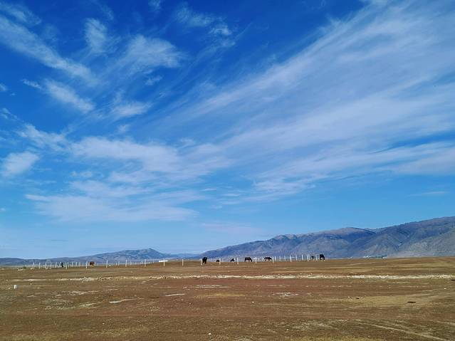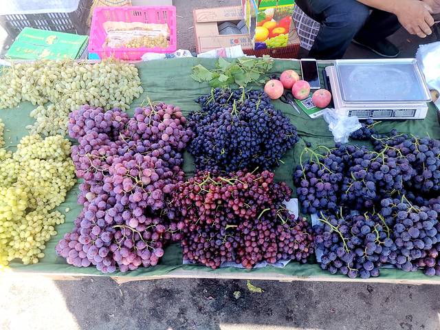 下了飞机准备找车直接去赛湖,当地的机场大巴专线司机开价600元,拉上我们的行李就想让我们上车。幸好留了个心眼走远处找了个出租车司机问价,300元,110公里的路程这个价格我们觉得还算合理,直接上车走了。夏师傅一路也和我们聊点特别有意思的经历,他说干出租行业刚刚三年,之前在邻国哈萨克斯坦做货运,那边的环境比较复杂,有时候还会面临点小意外。在师傅中途加油的时候,我看到路边有卖提子的,赶紧跑过去买,6元每公斤,个头又大,味道清甜,感觉占了好大的便宜,师傅看到了说这是当地人不吃的,不好吃,我们???
