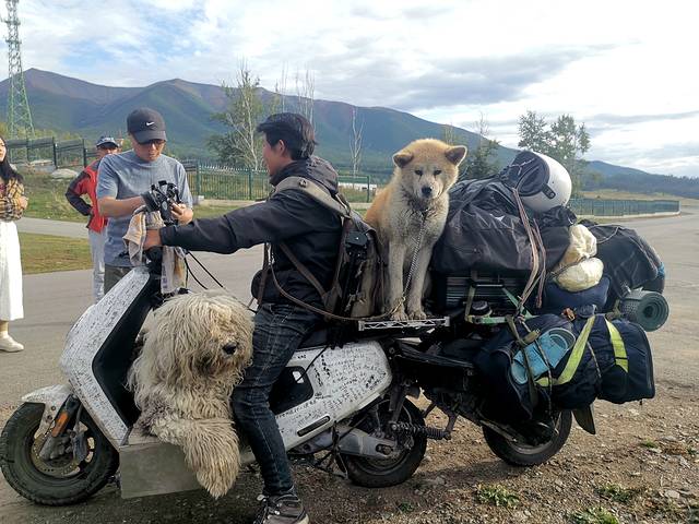 在白哈巴村村碑处碰到这位小哥,一人两狗,骑着个改良电动车,从云南出发自驾游,已经八个月了,勇气可嘉啊