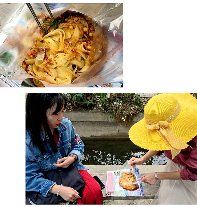 刚吃过饭就遇上正摆在路边的凉皮摊,漾说买一份尝一下,我们路边随便找个长椅就准备开动了,老板没有配一次性筷子,媚真是个百宝箱,居然随身携带了餐具。真的毫不夸张的说,是我吃过最好吃、最爽口的凉皮。