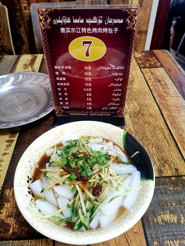 得知新疆国际大巴扎上午10点才开始营业,于是我放心的睡了个懒觉到9点,一路太通畅,到达大巴扎也才9点半,正好吃个早餐,工作人员推荐我附近一条小巷子的烤包子店,点了凉粉和烤包子,凉粉特别好吃,就是大清早的吃得透心凉啊。