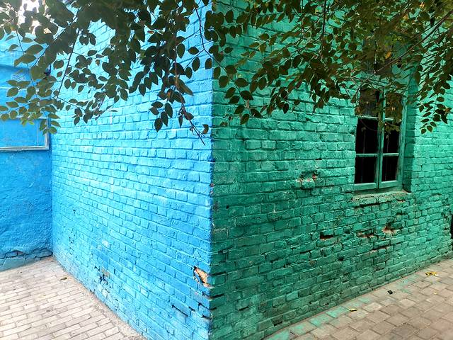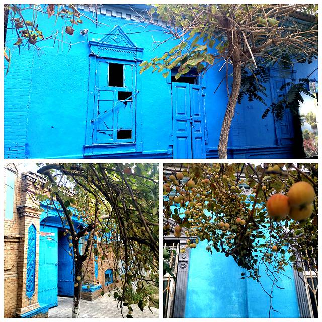 伊宁的民居总是会把五颜六色运用的恰到好处,虽然颜色很鲜亮,却并不会显得俗气,街道旁到处都是结满海棠果的树。