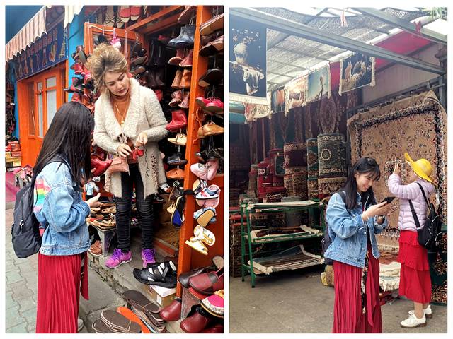 喀赞其入门口的鞋店和绒毯店,媚给她的小侄女买的皮鞋,质感还不错,隔壁店的手工绒毯做的很精美。