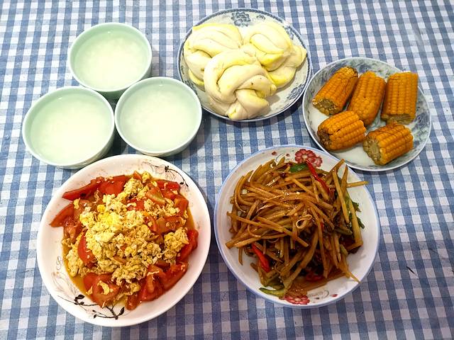 一大早吃了一顿丰盛的早餐,15元每人,一盘西红柿炒鸡蛋,一盘土豆炒羊肉,三个超级松软的花卷,还有玉米和粥,满满的一大桌才45元,是民宿的哈萨克族大姐做的,特别好吃。