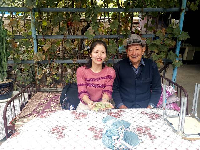 穿过阿依墩街区的时候,遇到一位刚好准备出门的老爷爷,问我们是哪里来的?我们告诉他我们是湖南的,老爷爷什么也没说就反身打开门锁请我们进他家去,并摘下院子里的一串葡萄让我们吃。老爷爷今年81岁,和儿子媳妇孙子一起住在这里,他说我们晚上可以住在他家,素昧平生的人,竟然能全心信任并款待我们,真的觉得很感动!
