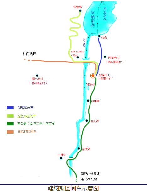 从贾登峪门票站乘坐景区区间车经过卧龙湾、月亮湾、卧龙湾三湾(均在进景区的左侧),一个小时车程才能到喀纳斯游客中心(换乘中心,可以寄存行李),这里可以换乘区间车到观鱼台(约20分钟)、喀纳斯湖边(约10分钟),白哈巴村(1小时)。