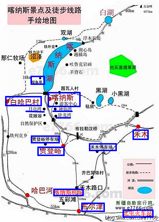 这是在网上找的喀纳斯景区的地图,位置也比较直观,蓝色的框线是我标注的常用地点