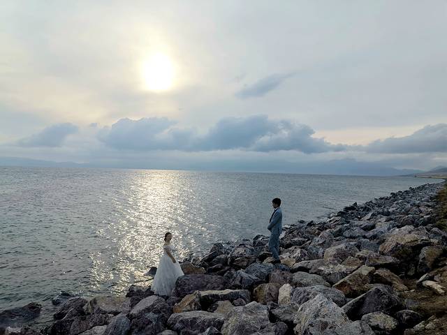 遇到一对正在拍婚纱照的夫妇,湖边超级冷,不过拍出来的效果很棒