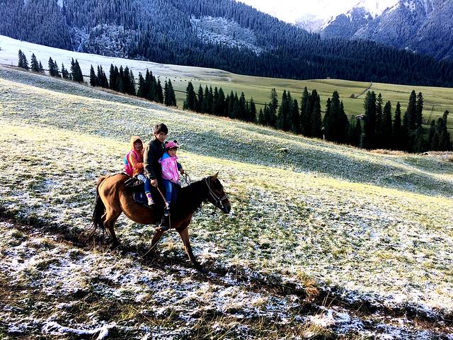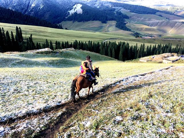 早上出门走走,和其他旅客聊聊天,刚好碰到有当地村民骑着马送两个小女孩去上学,骑马是琼库什台村很多人的交通方式,是他们的日常生活。