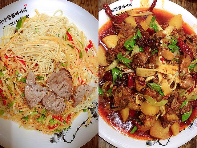 来新疆的第一餐就在酒店附近随便选了个餐馆,点了牛肉拌面、烤牛羊肉串、还有中份大盘鸡(才60元),量非常大,三个人根本吃不完。幸好有“大胃王”的漾,也没有很浪费。