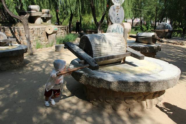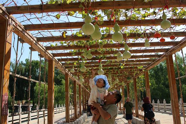 葫芦山庄离我住处有点远,打车55元,车程一个小时左右。兴城出租车起步价5元三公里后每公里1.7元。出租车给我们送去还有提成,但是提的是正价票,比如优惠票网上订票都不给出租车提成。景区有个戏水的游乐场还挺大的,但是我们去的时候有点冷已经关闭了,景区还有火车票价20元可以玻璃栈道,玻璃栈道要想上去票价5元。全程走下来3个小时足够而且是边玩边走边休息三个小时候就够了。里面有很多展区主要都是闯关东的东西,还有各种葫芦。朵朵还挺喜欢,因为里面还有跷跷板,木马,秋千什么的,里面也有吃饭的地方,但是觉得都不怎么样看着就没什么胃口。还有一个小邮局卖明信片,买明信片还给盖一个纪念章。还有喂小鸽子的区域,一袋鸽粮5元特别少一会就没了。里面还有卖酒店和酸奶,酸奶哪家还卖炒的10元一杯一点都不好吃。