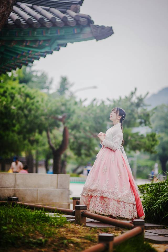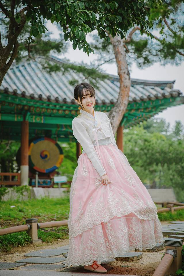 韩服的最大特点是直线与曲线相结合,穿起来给人一种舒适、优雅的感觉,短衣高腰裙的设计让身材有种被提高的既视感,短腿、胖腿的妹子也能很好消化哦,想来这也是韩服颇受青睐的原因之一吧~
