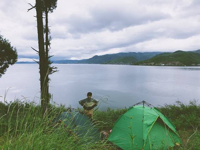 五点多开始慢慢走上环海西路,准备慢慢找露营点,六七点扎营,慢慢等天黑,等十五的圆月升起。后来因为环海西路各种不通,各种迷路,各种村子里乱窜,九点多才能找到一个露营点。车子停在路边,走进去两百米一个小树木,洱海边很开阔,晚上以为很将就,早上发现是个非常棒的露营地。