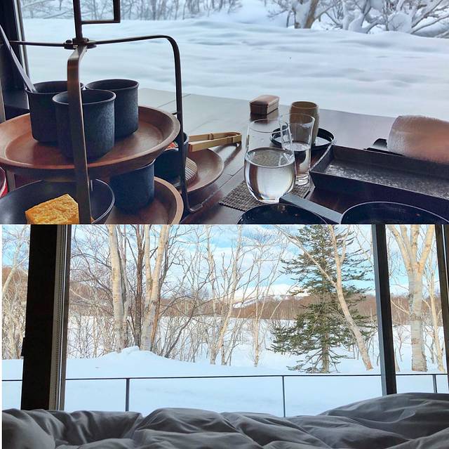 这家是何穗曾经打卡过的酒店哦~ 位于新雪谷町花园里的一座私人森林里哦!酒店只有15间房,房型有和式有洋式,分别是榻榻米睡舖和床式。沙发、床铺面向的方向,几乎都是一整大片的落地窗玻璃。所以一早起床就可以看见窗外美景哦!