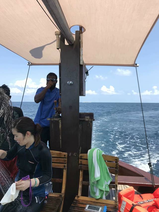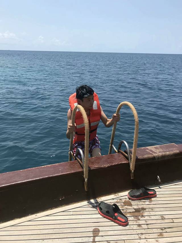 船上船员询问我们要不要在海里游泳,船上一起的十个人,都想要下水游泳,体验在深海游泳的感觉,胆怯的我穿着救生衣,也跟着下去了,虽然一直拉着一起陪我们下水的船员,只在水里待了一分钟,不过勇气可嘉吧,哈哈。我们张先生还是比较厉害,居然自己游出去挺远。