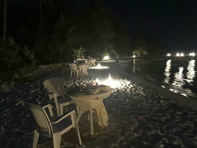 二人烛光晚餐,其实就是在餐厅外面的沙滩上,不过感觉还是有的。