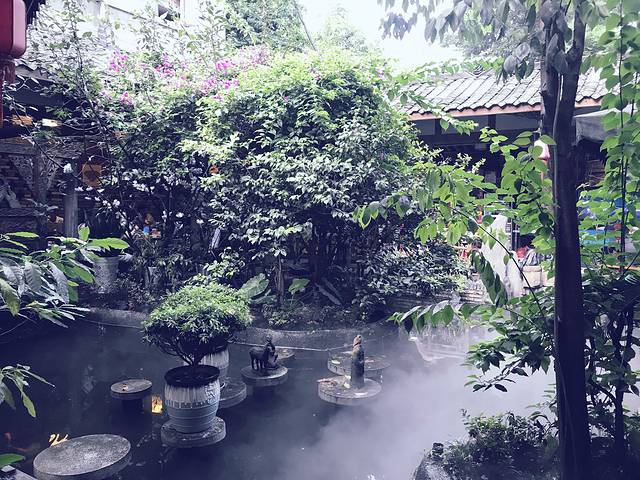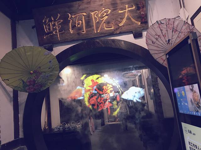 今天第一站决定去仙气飘飘,醉美阆苑,流连忘返的大院河鲜,都快吹爆朋友圈了,想想都觉得很激动人心。在雾里听古筝,于夜色享佳肴,早听说大院河鲜是一家仙气满满的河鲜馆,就慕名前来品尝。来的是九眼桥这边的店,一进门就能看见各种油纸伞零星的摆放在前厅的角落,不仅地上有,墙上、房檐下也都有,古风气息扑面而来。进去可以看见一个由“雾气”做成的“透明门”,门上映有鲤鱼和文字,并且是动态的,给人以不错的视觉体验。亭间有鱼,檐下有伞;青瓦朱檐,俗世人间。