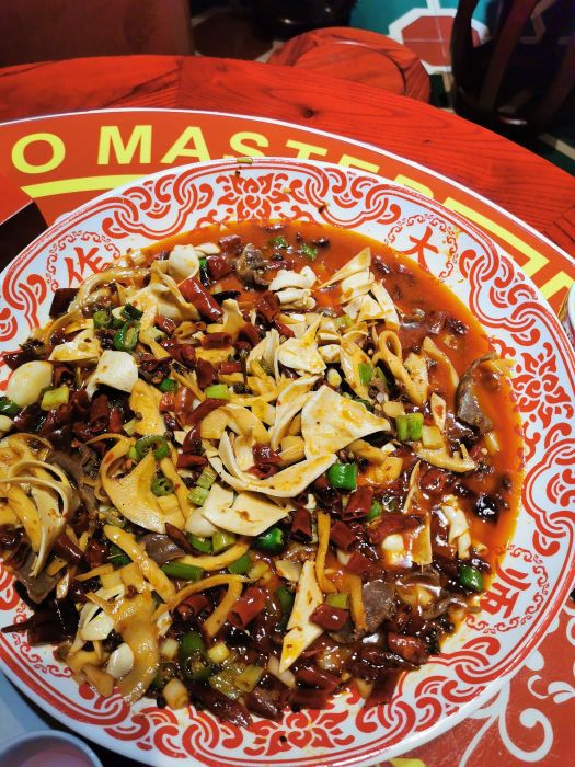 一出场自带高光的生扣极品仔鹅肠,拉直竟比成年男子还长,晶莹透亮,上桌现剪,肉眼看得到的新鲜。稍微一烫就立马卷起来,口感脆嫩,富有汤汁。锦城上上签,3种辣椒包裹的牛肉,辣星人的挑战神器。咸辣可口,后劲十足。功夫腰花,腰花凤尾状,入锅易熟,口口不踩雷。