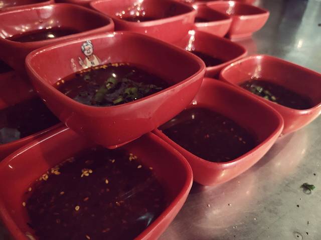 唯独有点个性的调料碟,里面有小米辣、生抽、调味汁混合而成,用辣香味提醒着你这是善调味觉、味色双蕴的成都。