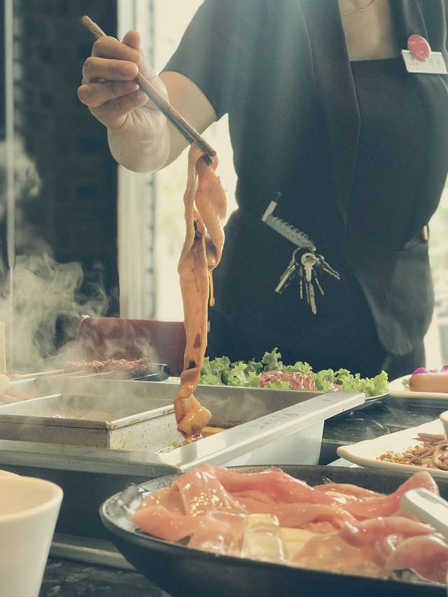菜品区主要有两面柜子,一个是素材,一个是荤菜,虽然价格略高一点,但胜在环境和氛围,夏天的周末约顿烧烤是再美好不过的事情了。烤的地方是开敞式的,可以看工作人员现烤,从这里过就馋的不行,诱人的香味四溢,让人等不及。