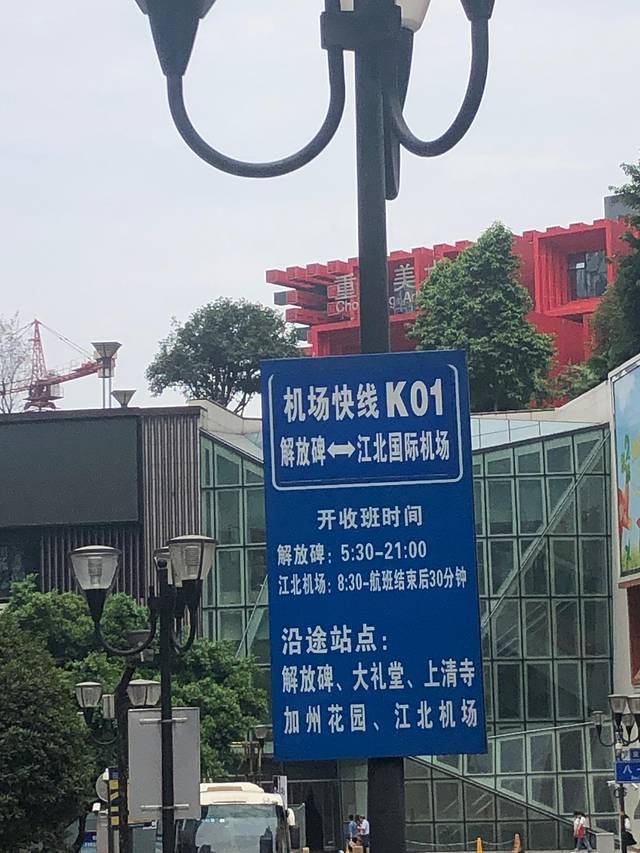整个大巴从T3航站楼到解放碑,行驶时间约为90分钟,大家看到这块指示牌,记住末班车,对于转机的乘客是非常关键的