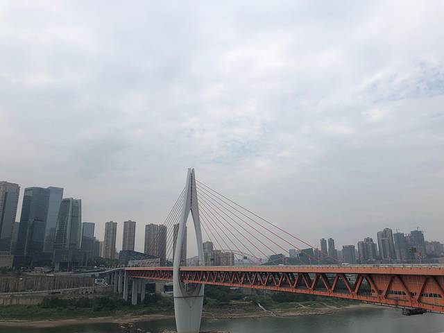 在洪崖洞旁,嘉陵江之上,屹立着千厮门大桥,今天虽然是不冷不热的阴天,大桥的抢眼度还是杠杠的