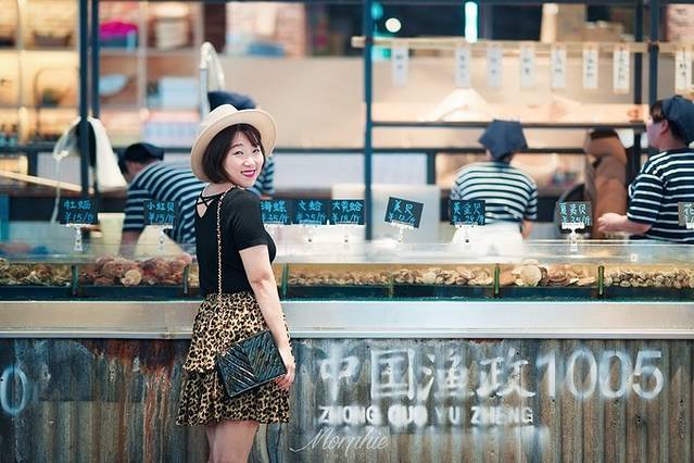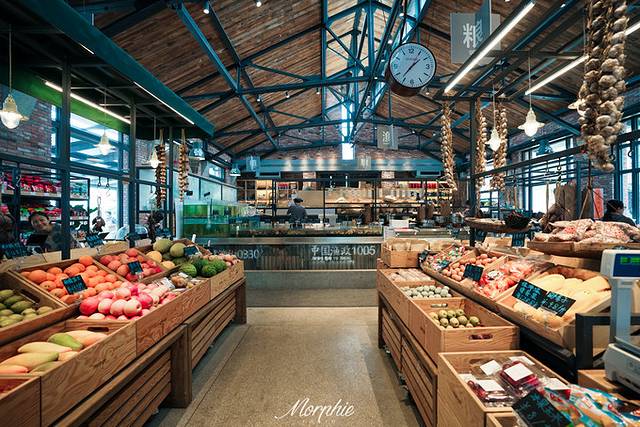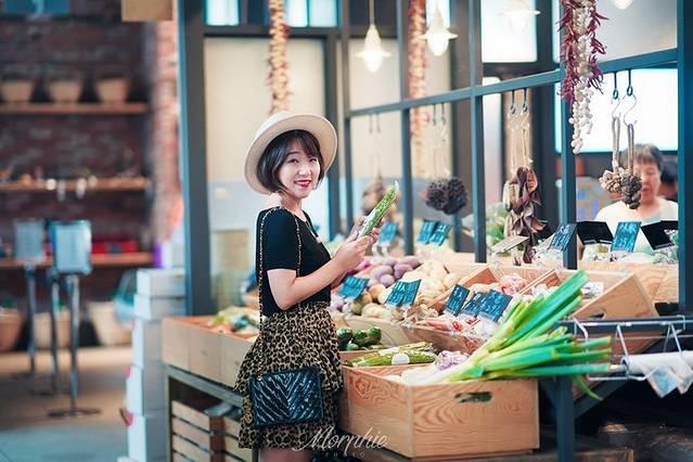 走进市集,更是可以感受到这里不同于其他菜市场的文艺风。店员们全都穿着条纹海魂衫,包着藏蓝色头巾,海洋的气息迎面吹来。裸露的铁艺框架和原木色货箱,有种日式的清新,就连各种文字招牌上字体的设计都自带高级感,出乎意料地很适合拍人像。