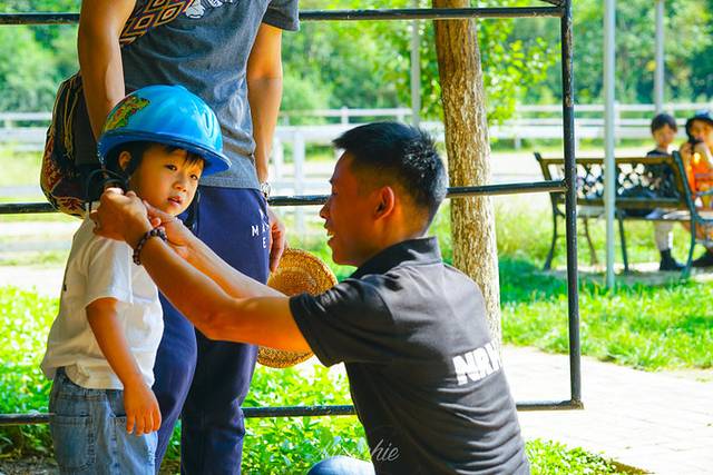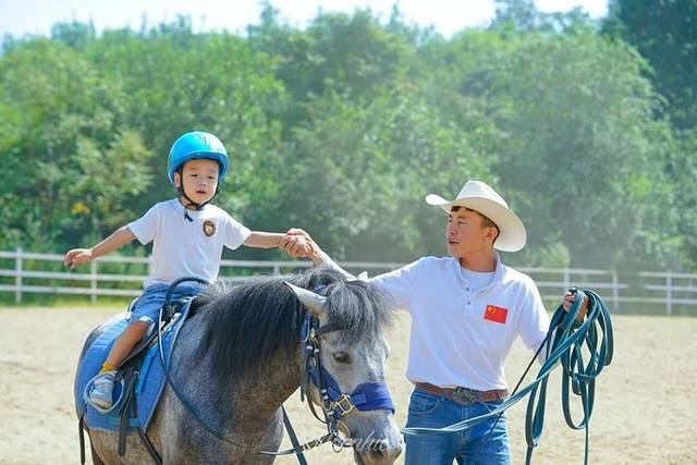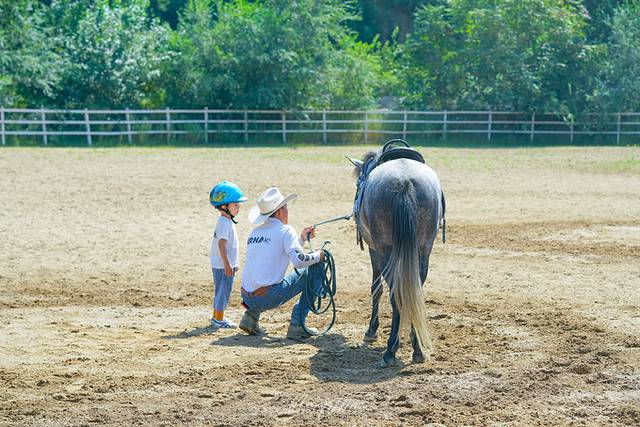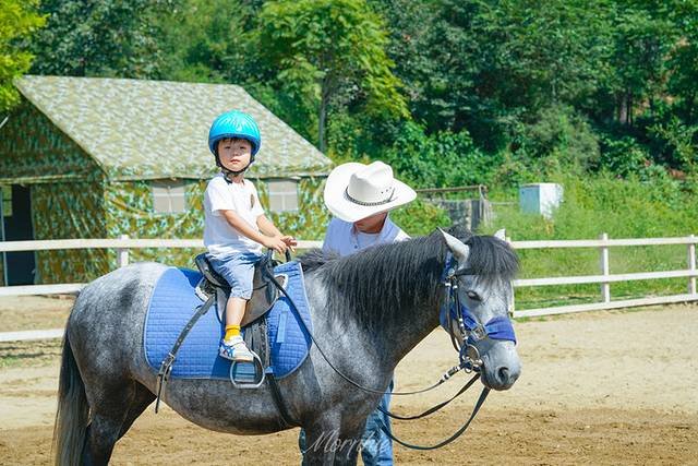 牧场专门为小朋友准备了中小型矮马,更适合他们骑乘。帅气的教练给我们戴上头盔、穿上手套,这就可以骑马啦。本着循序渐进的过程,从和教练一起牵马、到上马、再到顺利地骑在马上,summer适应得还是挺快的。据说小朋友学习马术比大人会更快掌握,看来果真如此。