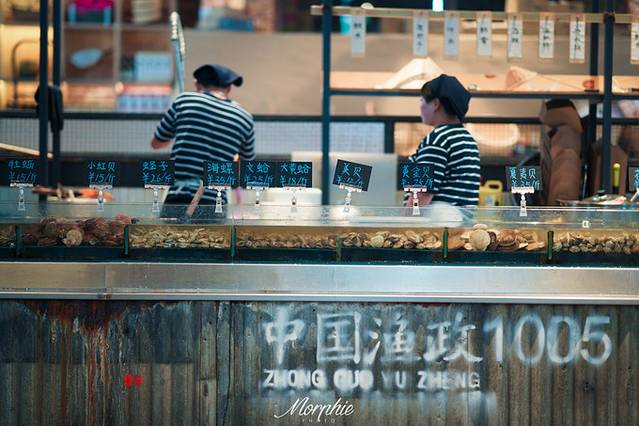 逛完单向空间,肚子已经咕咕叫了,于是就叫上老公带着儿子一起到海边市集来觅食。