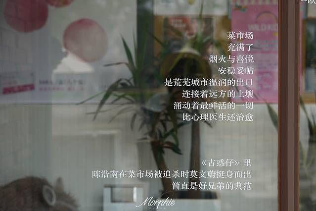 自动感应的玻璃门上贴着很多与菜市场相关的语录, 比如 ,古龙说,一个人如果走投无路,心一窄想寻短见,放他去菜市场。这是因为,菜市场充满了烟火与喜悦,安稳妥帖,是荒芜城市温润的出口,连接着远方的土壤,涌动着最鲜活的一切,比心理医生还治愈。你看,光是几句话,就展示出阿那亚与众不同的文艺气息了。