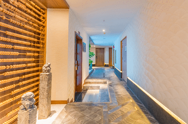 过道是用青瓦铺成的,两侧则用算盘珠和石雕柱搭配,从繁华的城市街道徐徐走进,恍若突然穿越,穿越到江南、穿越到古代,即便在浮躁的心此刻也能瞬间安静下来,这或许就是中国传统艺术的魔力吧。