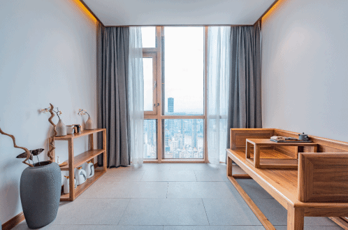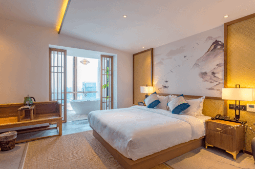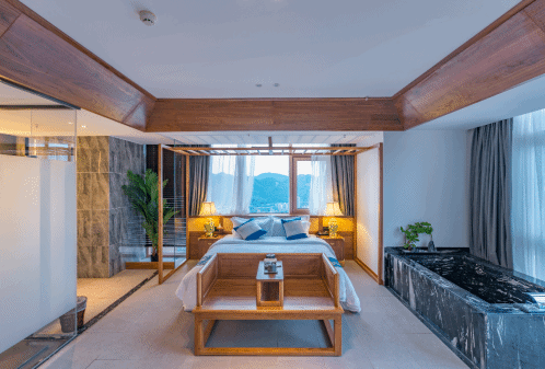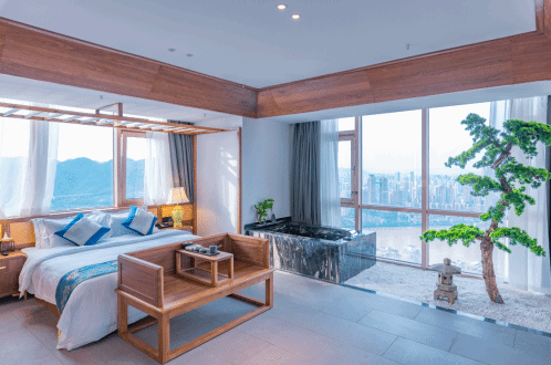 房间双面超大落地窗,270度观江,以原木为主的室内搭配中国风凸显,玉石打造的浴缸更将中国传统的玉石养生结合起来。米白色的碎石铺成的露台上“种植”有超仿真的迎客松,国风味道浓厚。