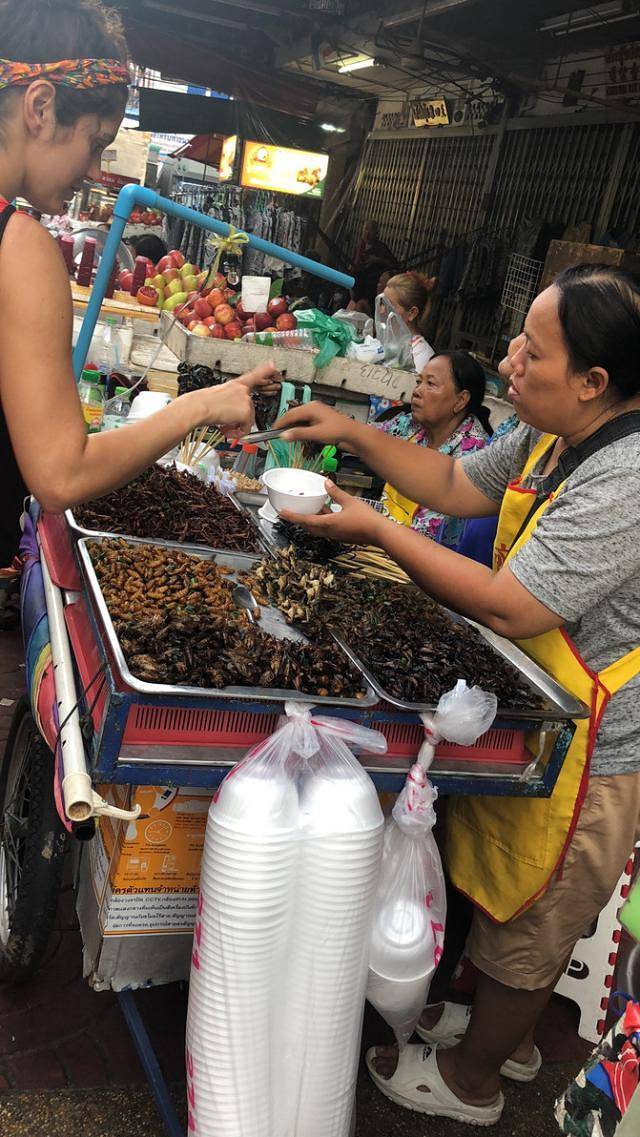 下图就是著名的考山路夜市。有很多当地著名的小吃。我们还在考山路体验了一次“泰式马杀鸡”,150泰铢/每人/半小时。还算是挺舒服的,但是一定要注意安全,选择正规的店面,最好是几个朋友(有男生)一起。