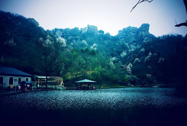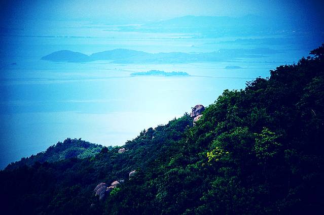 巨石山的主峰龙头峰海拔520米,我们稍作休整之后便朝山顶出发了。在上山的路上,我极细的发现,除了山路外,其余的地方没有过度开发, 还能看到原始的风景,天然去雕饰,有种自然的美。我们在山腰处休息的时候,事业就已经比较开阔了,可以看到远方湖泊与云雾相连,也能看到山脚下的小村庄,颇有一种田园诗意。