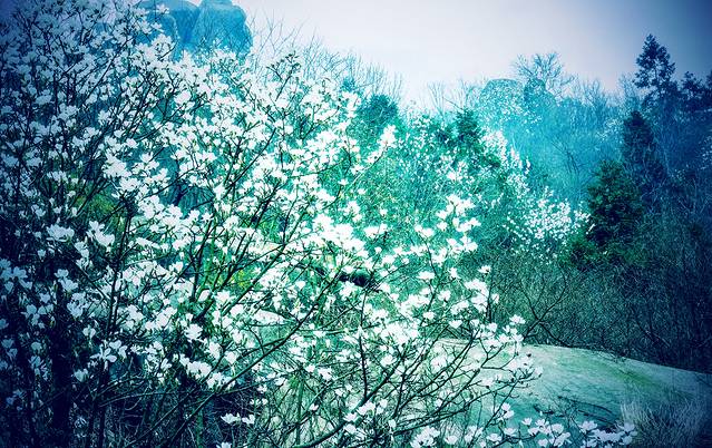 等我们到达山顶时,山下云雾缭绕,绿色的林海若隐若现,比我想象的还要美。巨石山上还有全国罕见的万株野生白玉兰,可惜我们来的季节不对,花已经谢了。听当地人说白玉兰盛开时,如白云环绕在山间,如梦如幻,满山都溢满了清香。听得我心驰神往,一定要在盛开季节来一次。