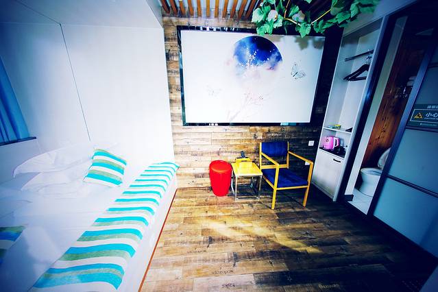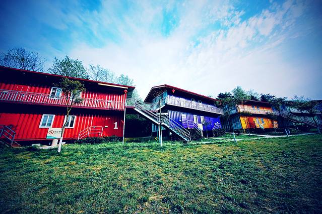 虽然诸多选择,我还是选择了网红集装箱酒店,由一堆集装箱改建的酒店,每个5.6米*2.2米的集装箱,室内风格挺适合的,一股轻奢风格,但是里面的每个用品全部都是爱情模式!心形杯具,心形洁具,成双床上用品!