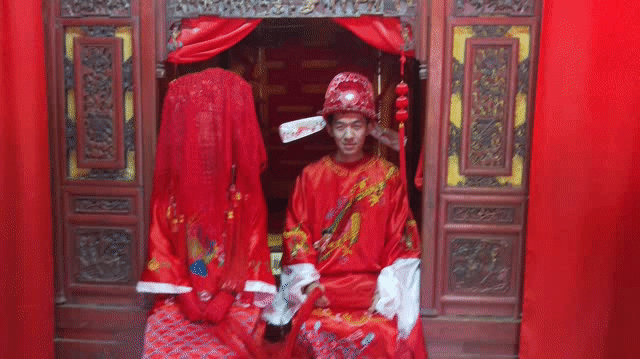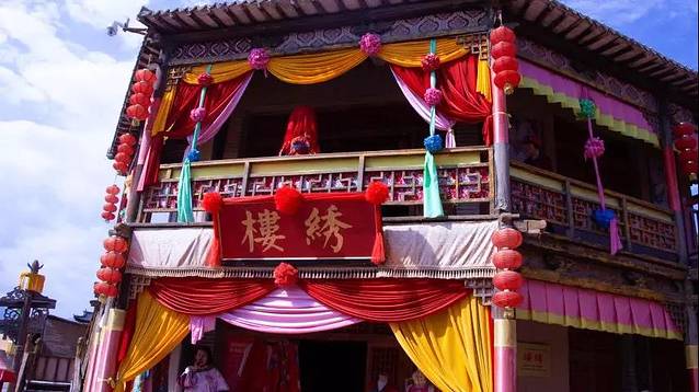 继续前行的时候,我们的小伙伴突然被一个不明物体砸中,接着来了几个人开始给他“梳妆打扮”,小伙伴一脸疑惑,莫名其妙的被拉去和一个从未谋面的女子成亲(此时的小航在旁边笑得很开心),原来是抛绣球招亲,其实这也是影视城的一个体验项目啦,是为了能够让更多的人融入到这个情境中。