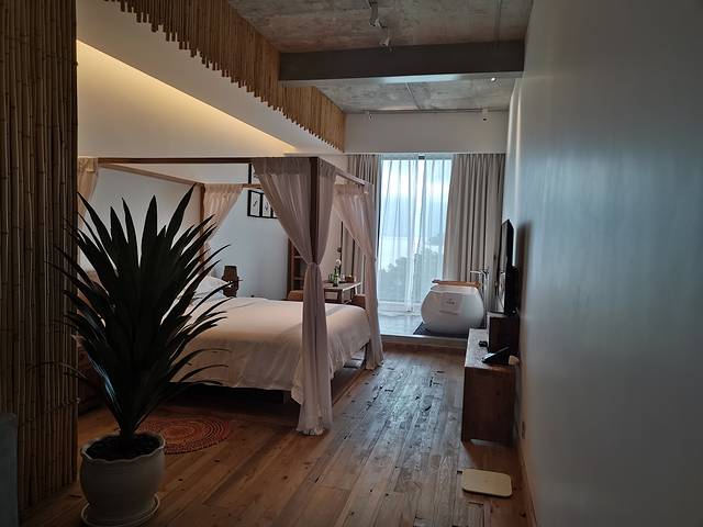房间简单明了、不过房间装修材料、配套设施很考究、低调奢华、不比五星酒店差、想必老板很懂生活