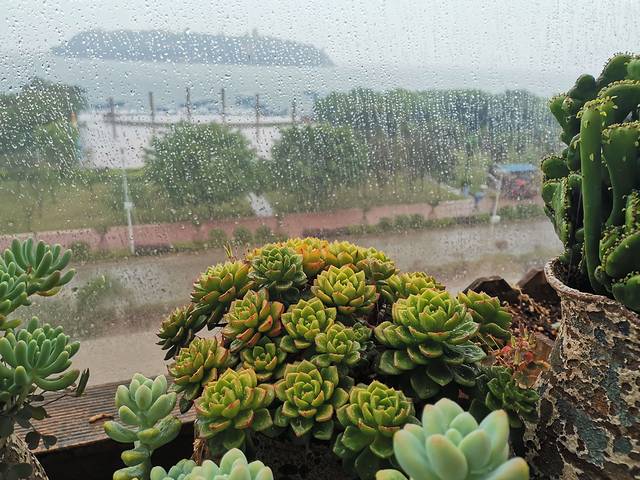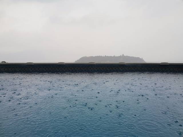 果然进入抚仙湖附近就开始下雨、小姐姐在门口举着一把彩虹伞等我、笑得很甜、笑容会传染、这样的笑容也让我感觉到亲切、这个是民宿四楼的游泳池、以及对面的孤山、烟雨蒙蒙的风景、别有一番风味、