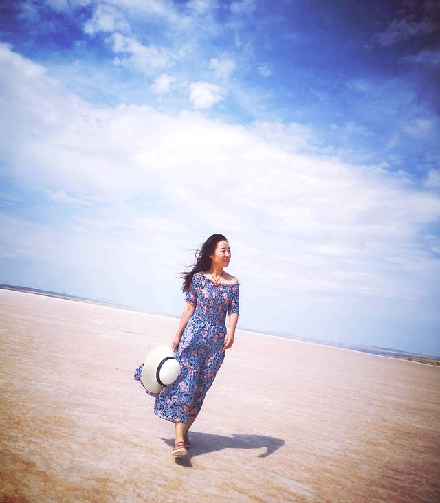 天空白云朵朵,湖面白盐皑皑,太阳高高悬挂头顶,可是风那个大啊,吹得帽子都戴不住,我穿得也太凉爽了啊😱