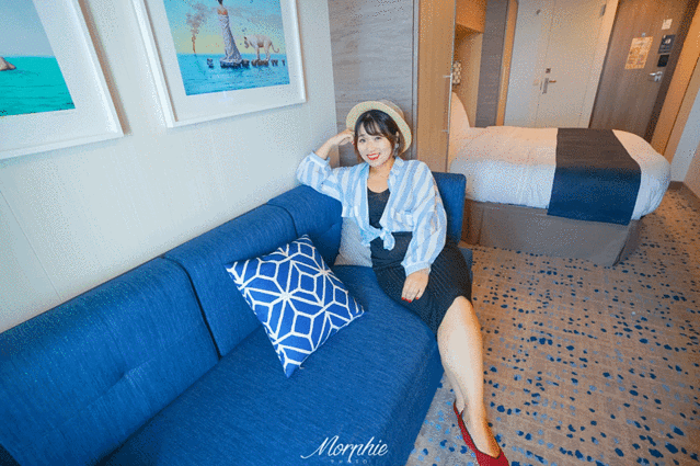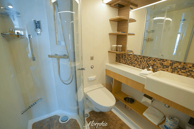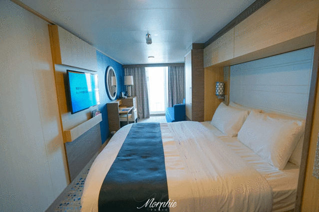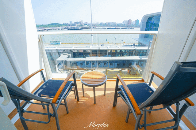 这次游轮之旅特地选择了阳台房,因为我真的特别喜欢阳光照进房间里暖洋洋的感觉。光谱号的房间让人眼前一亮,没有夸张,真的有一种别具一格的感觉。房间不大,但是布局整齐,非常干净温馨,绝对的五星级酒店标准。洗漱过后,整个人躺在大床上,柔软的床垫就像把我拥进去一般。我最喜欢房间的阳台,阳台小小的,摆着两张躺椅和一张小桌子,躺在这里晒太阳再舒服不过了。每天早上我都是被阳光唤醒的,温暖的阳光从大大的落地窗洒进来,照亮整个房间,感觉一天的好心情都从这一刻开始。而且平稳程度跟我之前想象的完全不同,就跟睡在陆地上一样安稳。