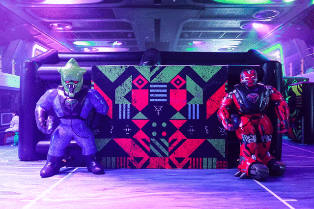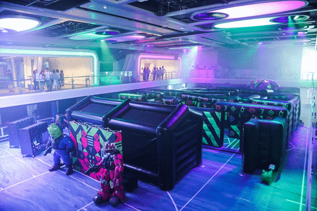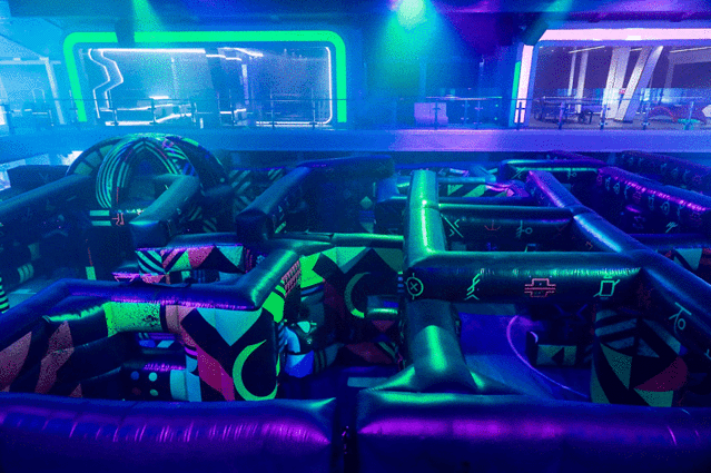 镭射对决有点像打真人CS,这可是小朋友们的心头好。一进入场馆就像来到了未来世界,昏暗的环境、绿色的灯光,烘托出科技感的氛围。充气玩具做的隔断让小朋友们可以安全地在里面“打打杀杀”。整个场地就像一个迷宫一样,孩子们穿着酷酷的“星际装备”,用激光枪进行一场外星人和机器人的“对决”。他们叫着笑着闹着,别提有多开心了!